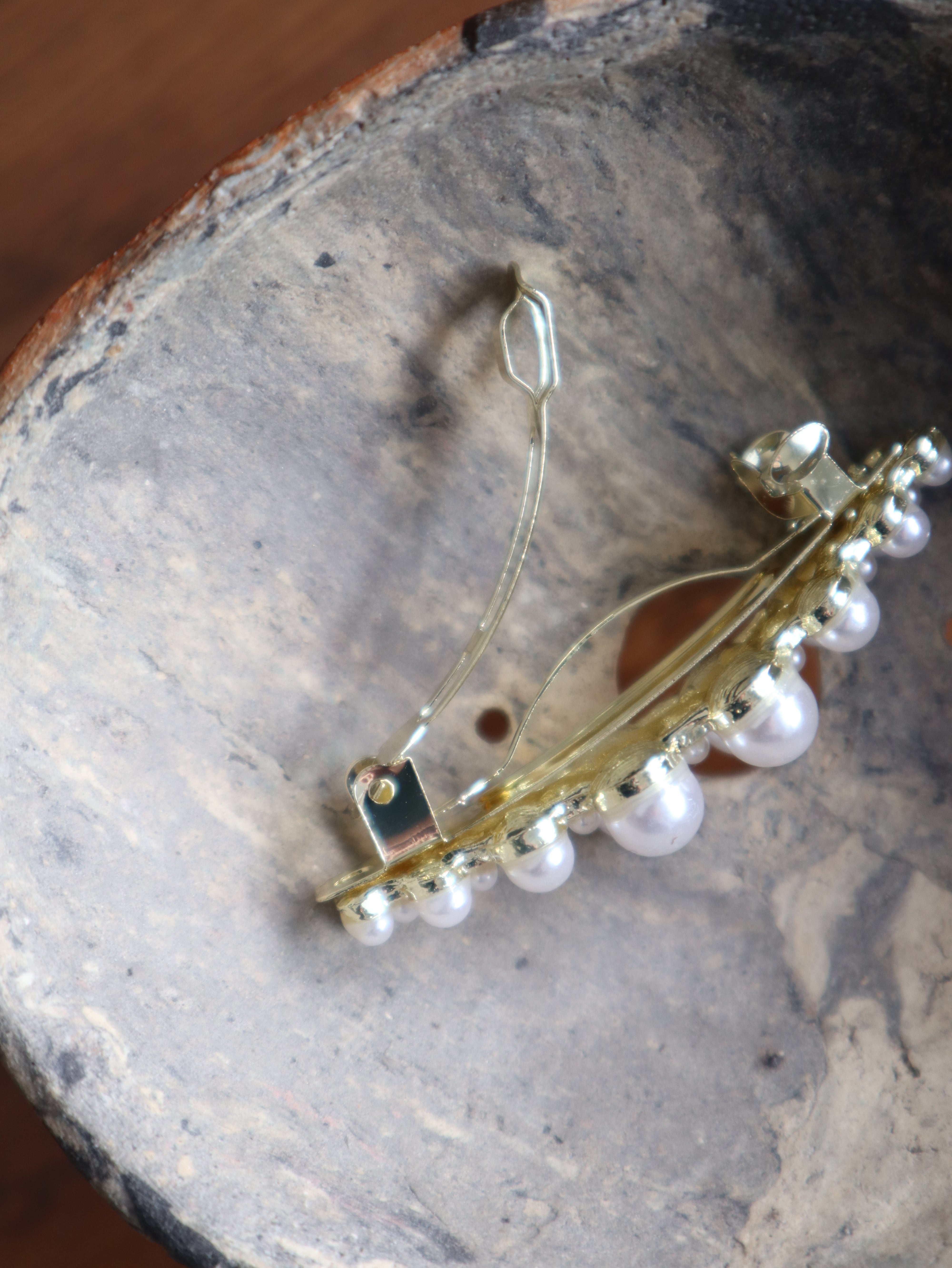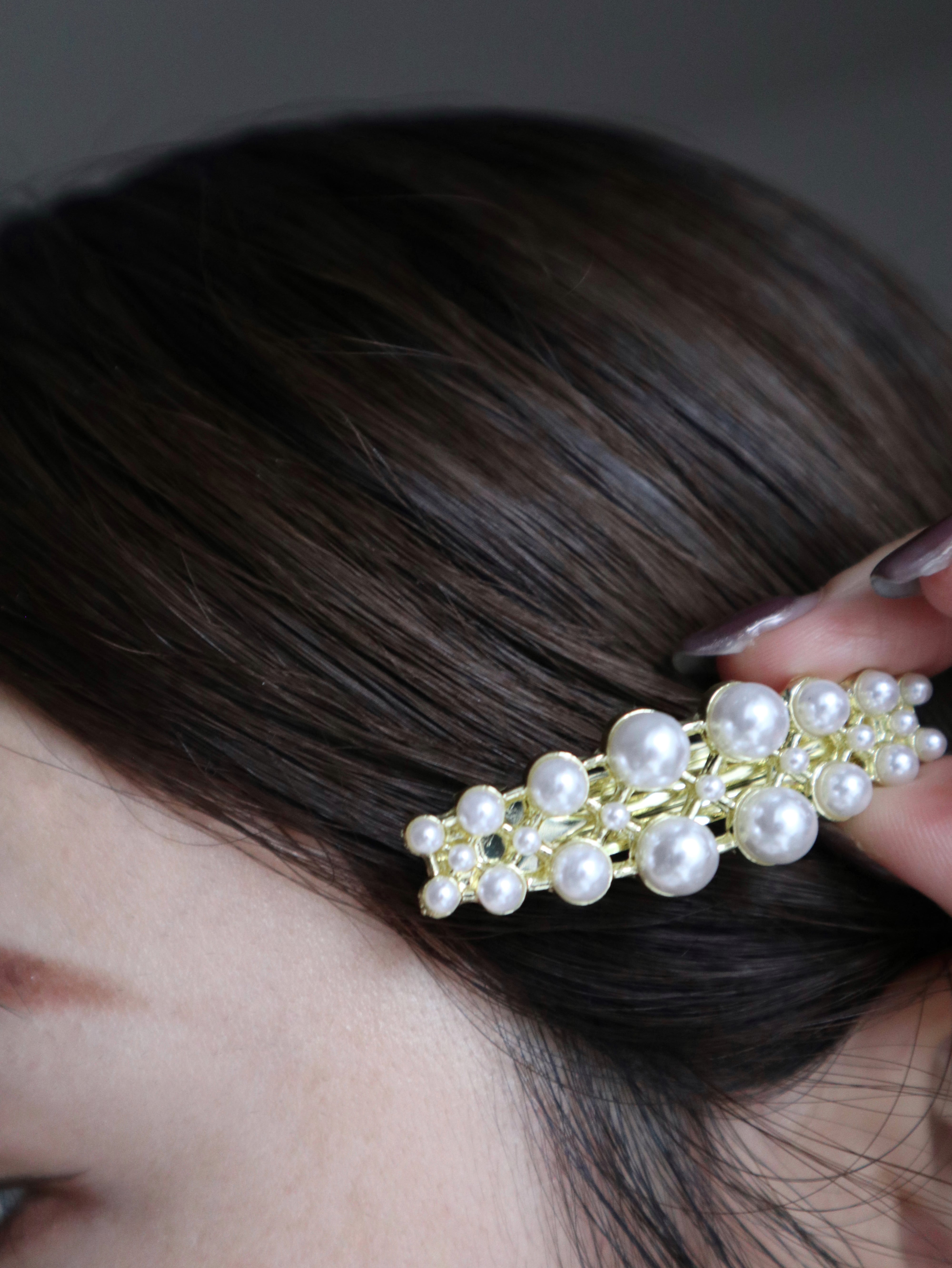 ⟨ select ⟩ 素材:合金、樹脂パール サイズ:縦幅1.5cm/横幅6cm 色:ゴールド 前髪を留めたり、ヘアゴムを隠すように留めたり 程よいサイズ感で色々なヘアスタイルを楽しめます。