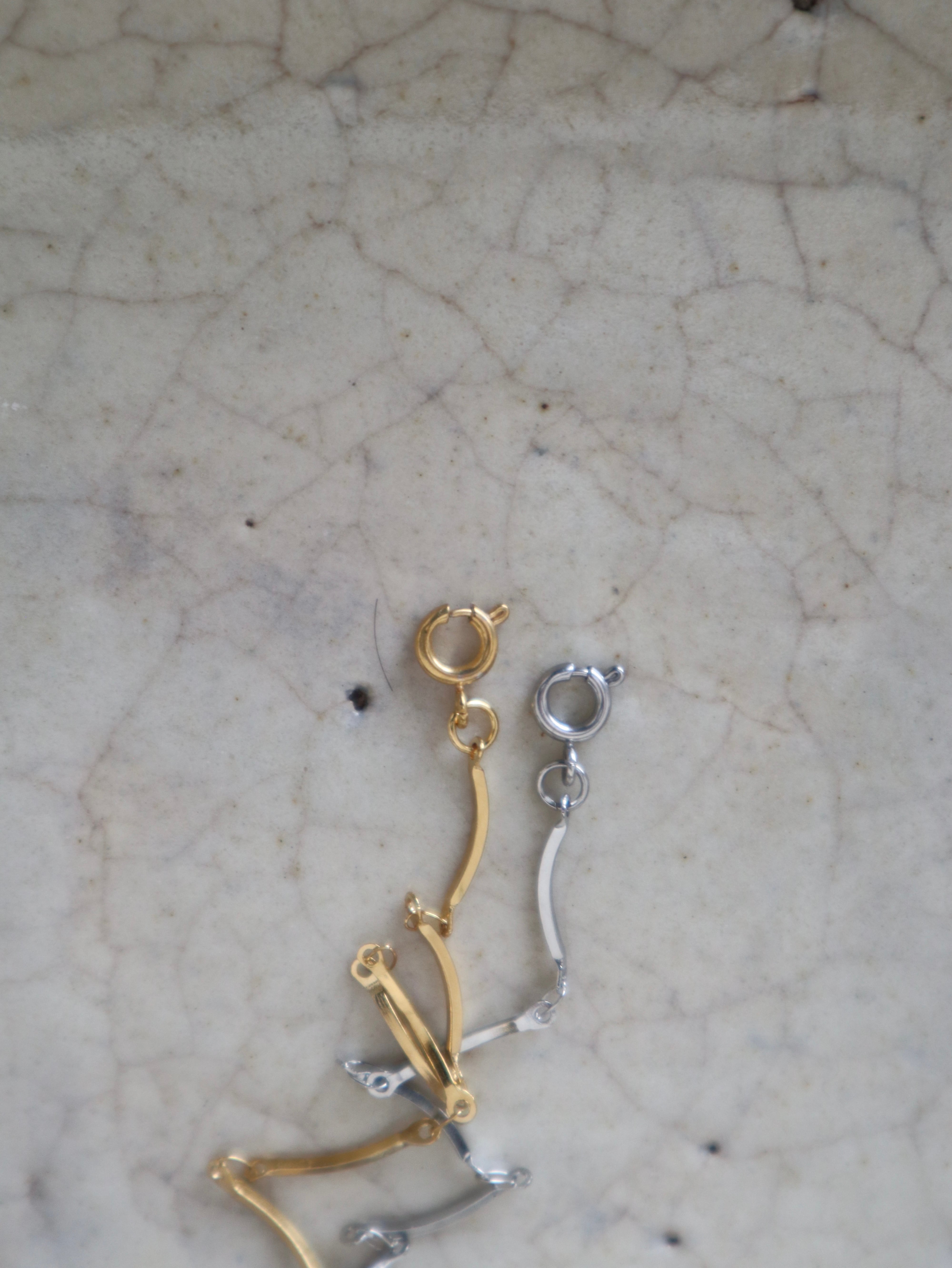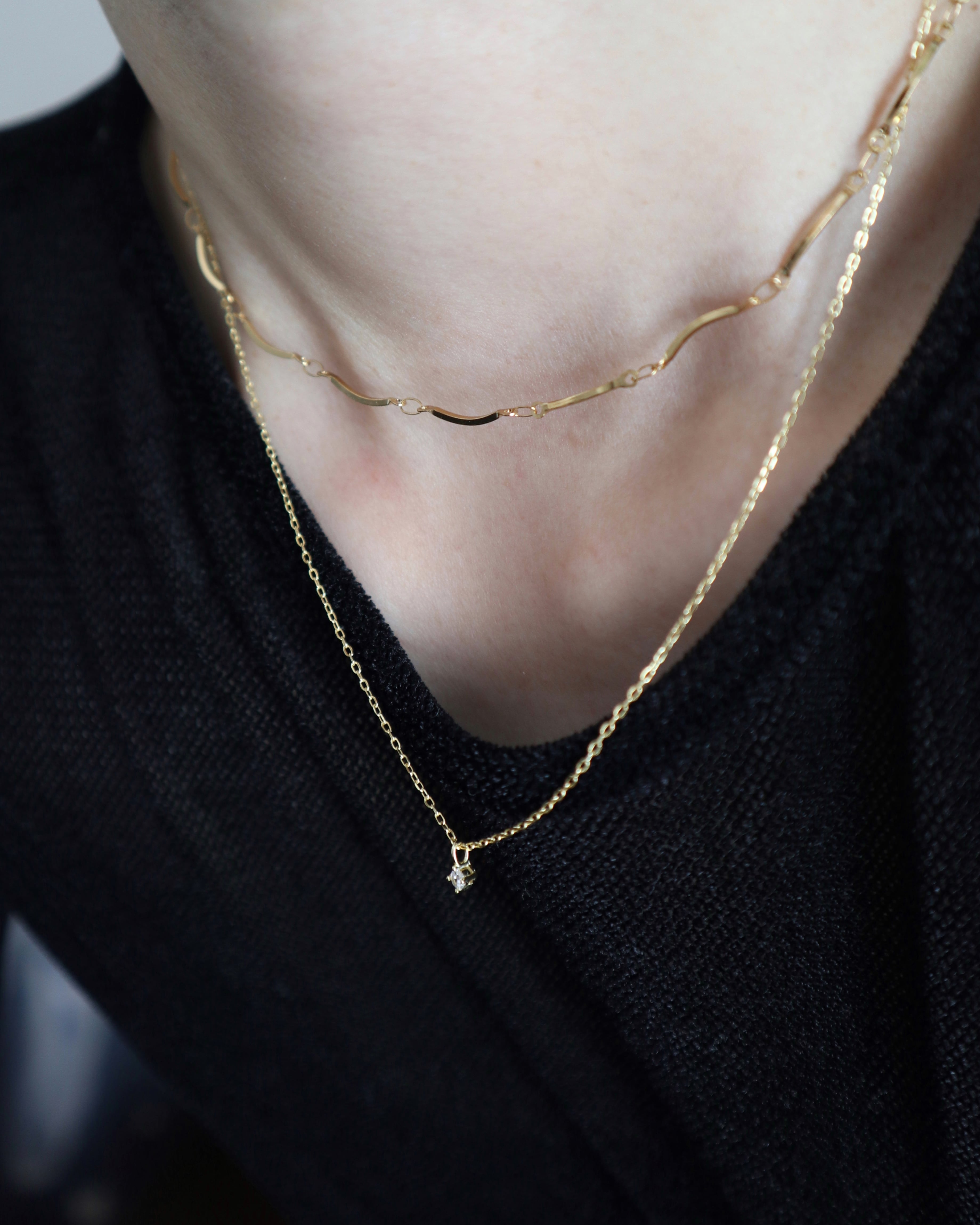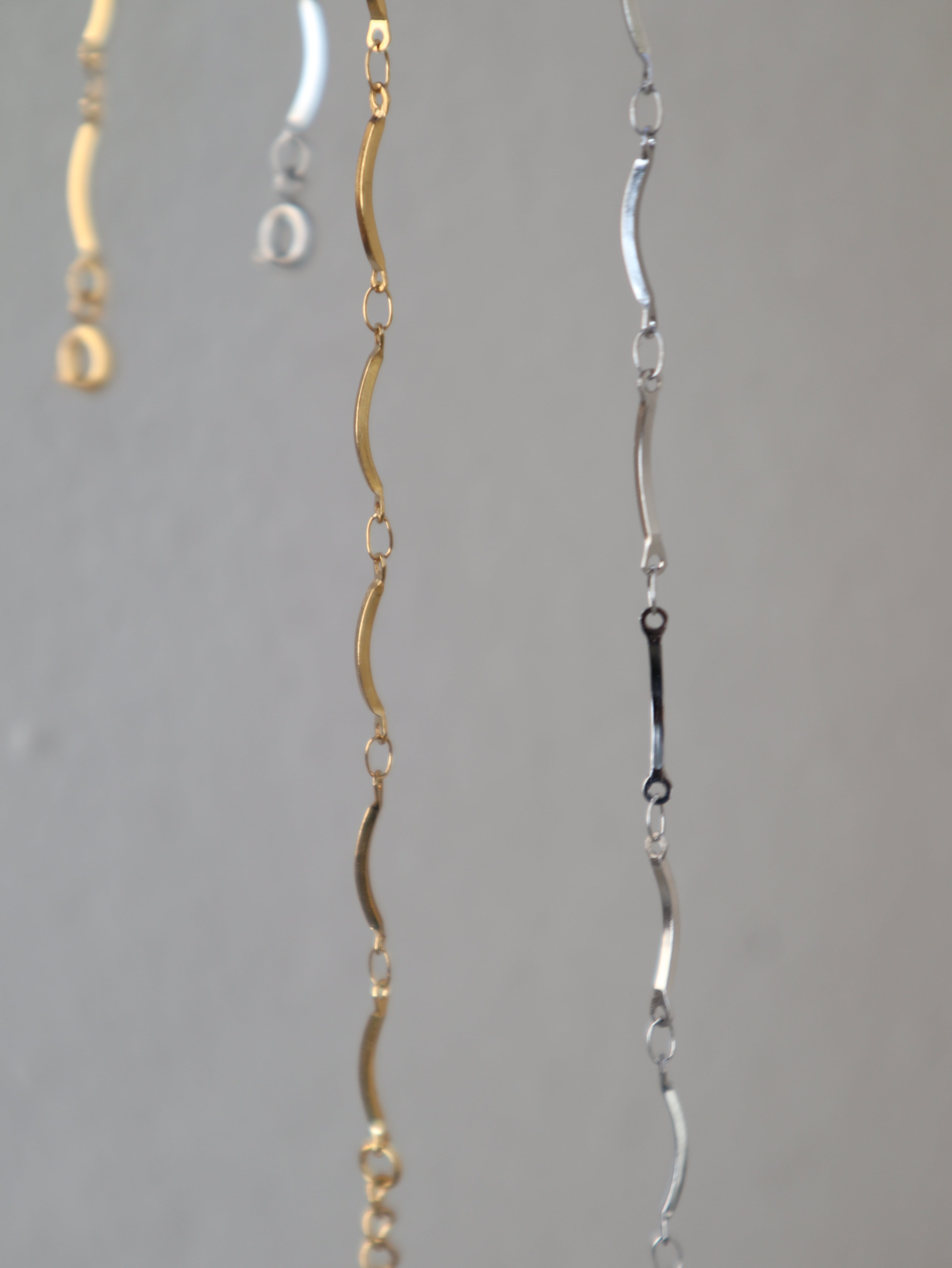 ⟨ handmade ⟩ 素材:サージカルステンレス サイズ:34cm +アジャスター5cm 色:シルバー/ゴールド ゆるやかに波打つチェーンが印象的なネックレス。 動くたびにやわらかく光を反射し、首元にさりげないニュアンスを添えてくれます。 シンプルなトップスに合わせるだけで、ぐっと洗練された印象に。 一本でさらりと、重ね付けのベースとしても活躍します。 素材はサージカルステンレス。 錆びにくく、変色しにくいため、毎日に安心して身につけていただけます。