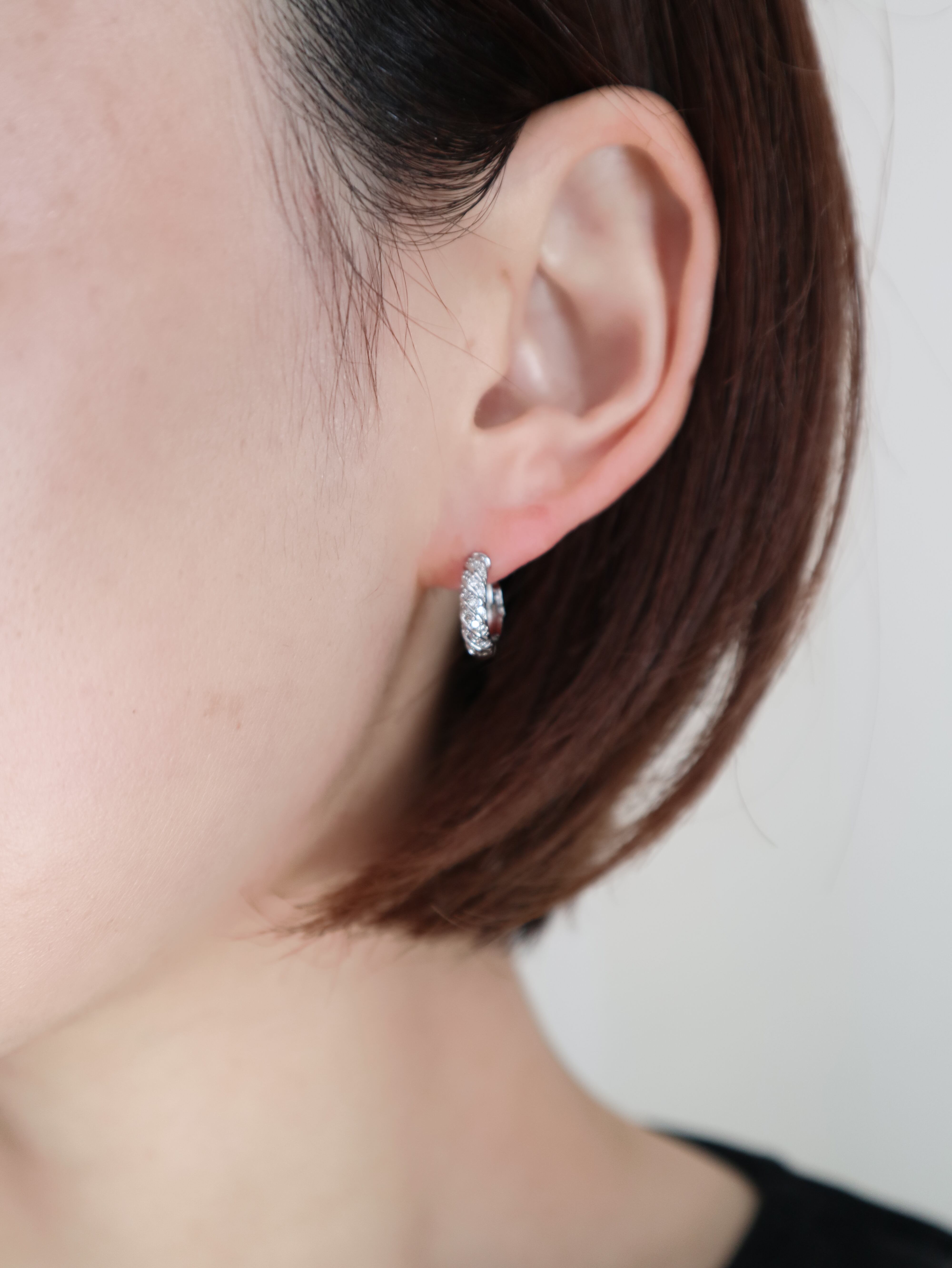 ⟨ select ⟩ 素材:合金 サイズ:14mm、幅3mm 色:シルバー 繊細に敷き詰められたストーンが、 上品な輝きを放つフープピアス。 華やかさがありながらも、 派手すぎず、大人の装いに自然になじむデザインです。 顔まわりをぱっと明るく見せてくれる存在感で、 特別な日にも、きれいめな日常にも。