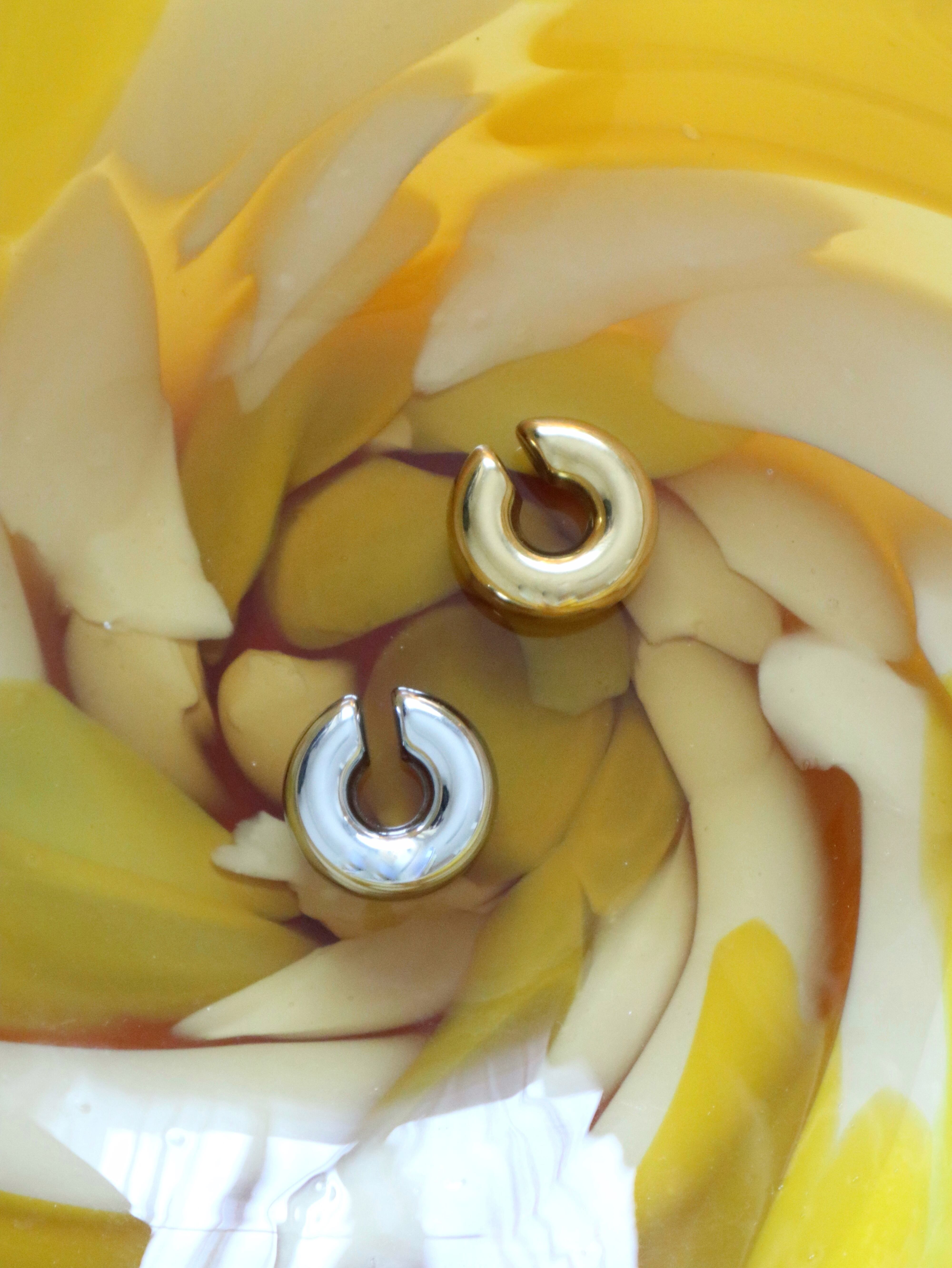 ⟨ select ⟩ 素材:ステンレス(18Kコーティング) サイズ:幅9mm、全長30mm 色:シルバー/ゴールド かなりボリューム感のあるイヤカフです。 顔周りが明るく華やかな印象になり、 シンプルなファッションを彩るアイテムに! 腐食しづらいステンレスなのも嬉しいポイントです。 中が空洞になっているため、軽いのも◎